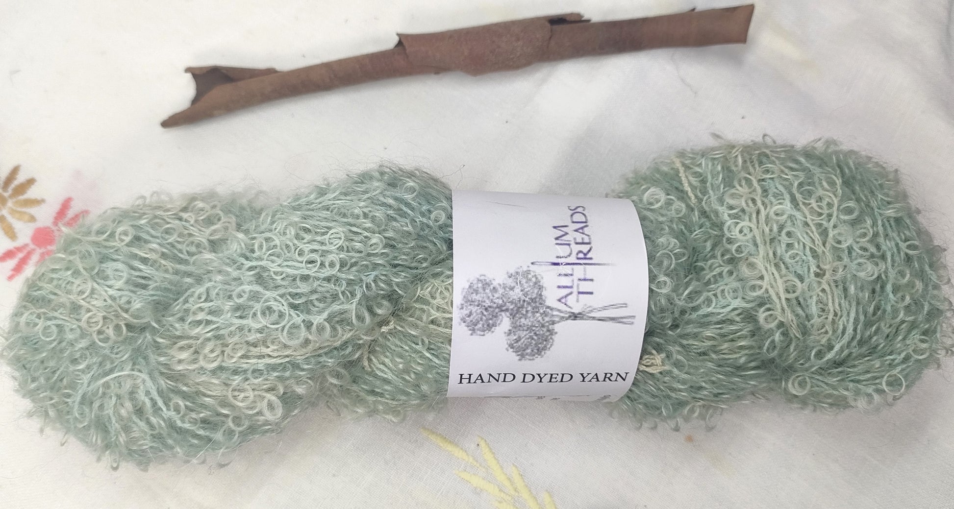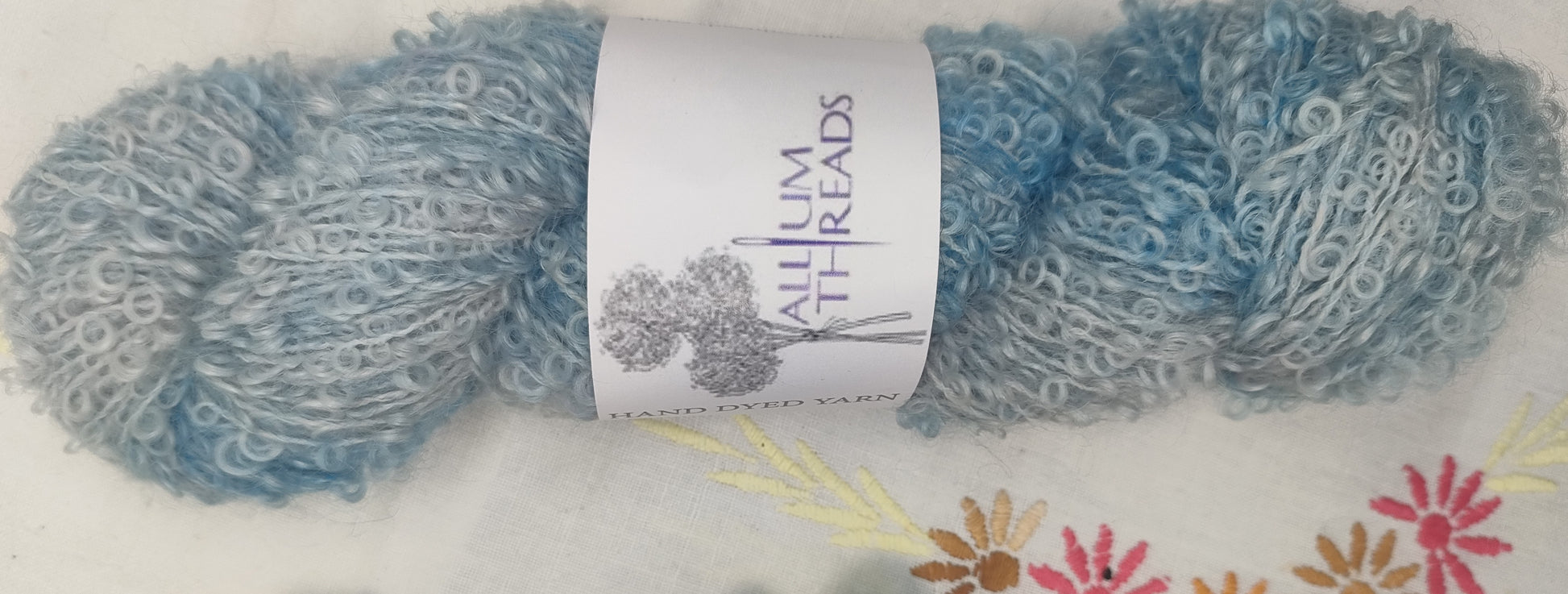 This is a fun boucle yarn which has a smaller sized loop than the chunky version used for the Bladder-wrack neck wrap. It gives a beautiful texture when knitted up. The nylon content provides a strong thread required to hold the boucle loops.