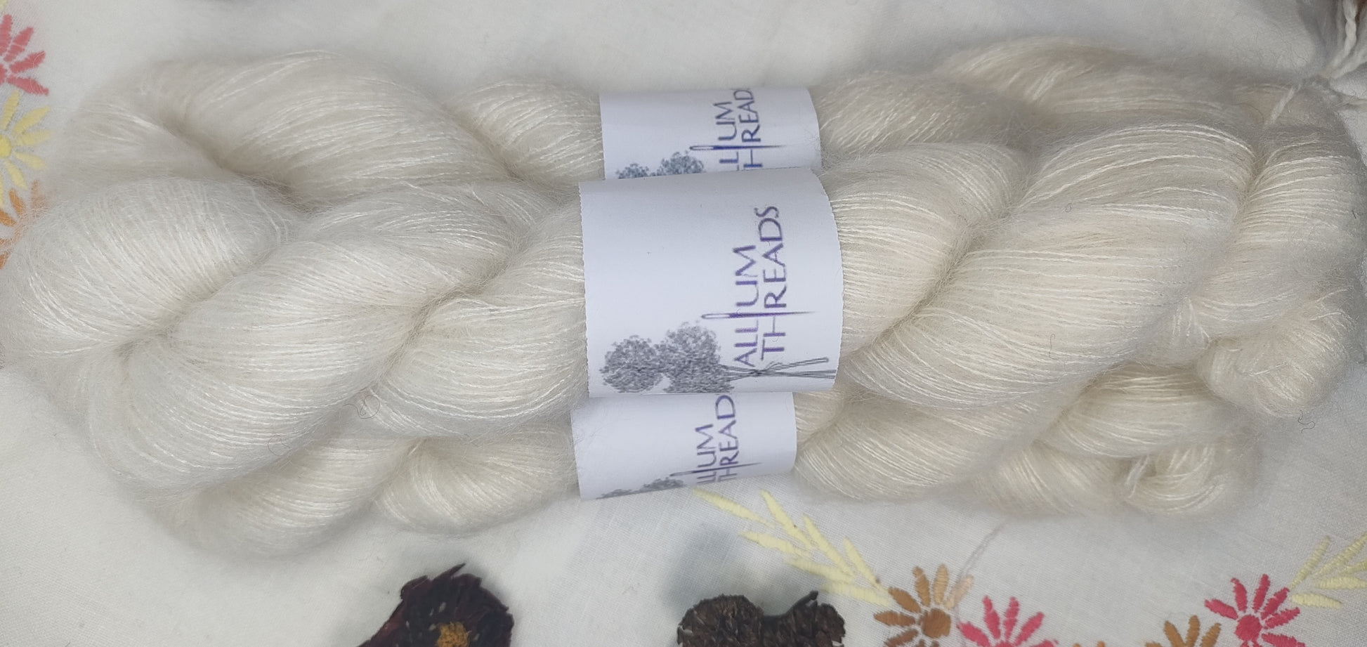 This are 50g skeins of Lace weight Seedhead base yarn. It is made of mohair and silk. This gives a soft halo and can be used on its own or is also beautiful held together with another yarn. Try using it that was for a jumper or tee. 72% Kid Mohair, 28% Silk - Lace weight 50g Skeins Approx. 420m It is not dyed and is a warm white. Due to the nature of hand dyeing, the colours in each skein may be slightly different and no two skeins will be identical. As with any hand dyed wool, if using more than one skein then alternating skeins on every couple of rows will help to balance any slight differences. |