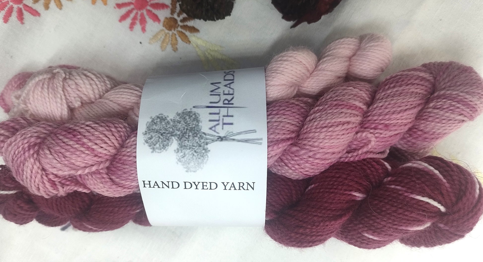 These are mini sets of 5 x 20g skeins of high twist merino and Blue Faced Leicester yarn, one with silver sparkle. All my bases are named after parts of plants and trees. Therefore the set totals 100g. The set is made up of pale pink, striped pink, red with white spots, variegated purple and mauve with silver sparkle and striped pinks. Four ply 100g % Approx. 365m This is a very soft and versatile workhorse yarn. The nylon content makes it strong so it can be used for a huge range of items; socks, shawls, sweaters, hats and gloves. It has been hand dyed by me in my studio with logwood, lac and cochineal. I have tried to capture the colour of the yarn as accurately as possible. Please bear in mind that monitors vary and colours can be perceived differently. Due to the nature of hand dyeing, the colours in each skein may be slightly different and no two skeins will be identical. As with any hand dyed wool, if using more than one skein then alternating skeins on every couple of rows will help to balance any slight differences. |